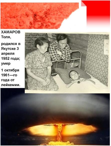 ХАМАРОВ Толя родился в Якутске 3 апреля 1952 года; умер 1 октября 1961-го от лейкемии. Давно уже, не дожив и до пятидесяти, ушли в вечность его мама с папой. Сверстники и друзья Толи даже не могут вспомнить точно – в каком году он играл во дворе с внезапно выпавшим снегом красного цвета: в конце пятидесятых, или в начале шестидесятых: так давно это было. Но родственники и близкие этой семьи всегда связывали смерть Толика с тем красным снегом.